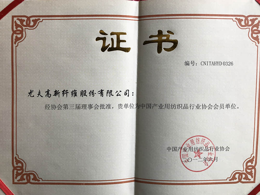 2012產(chǎn)業(yè)用紡織品行業(yè)協(xié)會會員單位證書